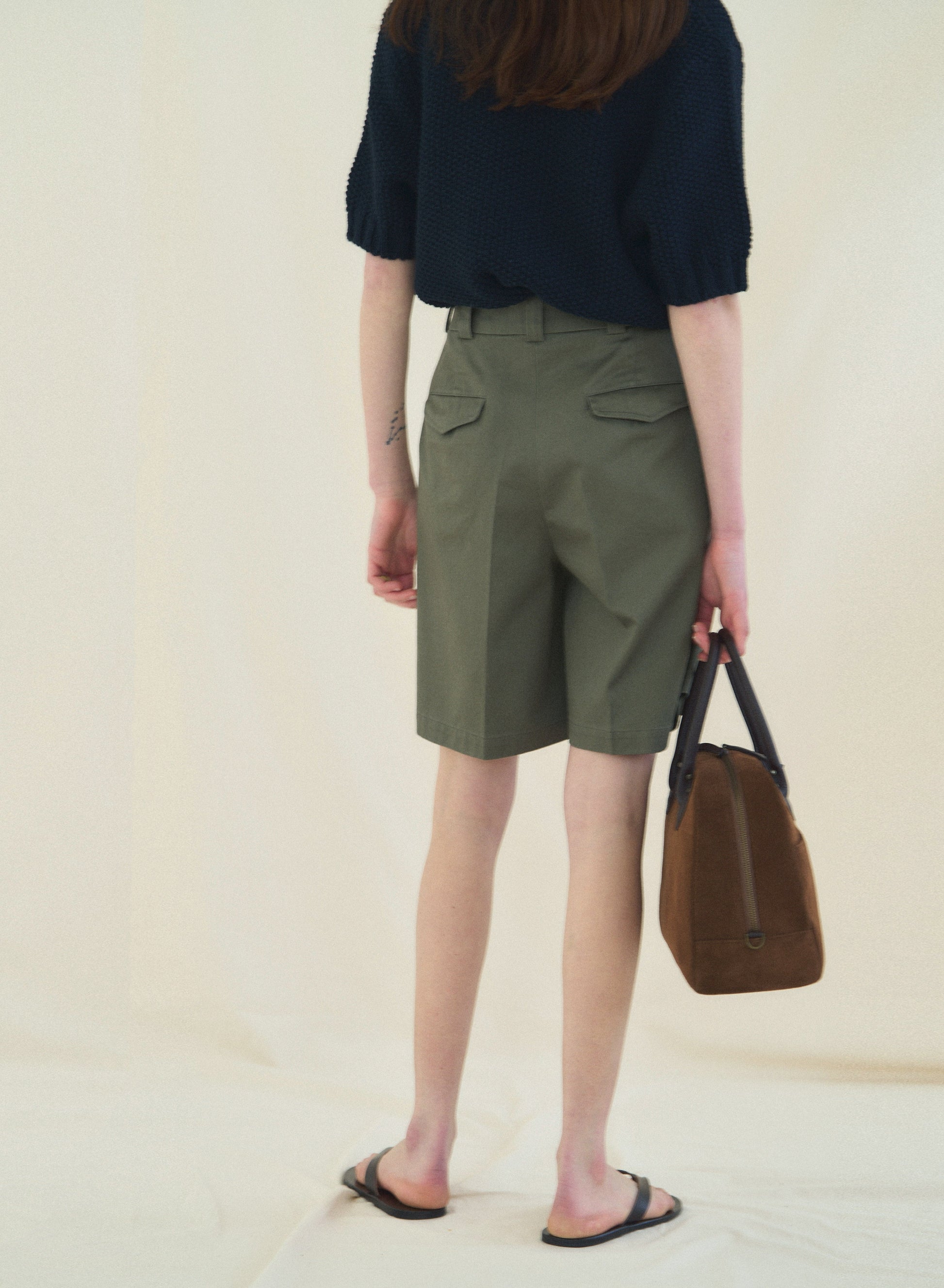 日本製の高密度チノ生地を使用し、程よいハリと柔らかさを兼ね備えた質感に、さりげない光沢が上品さを添えています。ノーマルウォッシュ加工を施すことで、程よい柔軟性と自然な馴染み感が生まれ、耐久性に優れるだけでなく、非常に快適な穿き心地を実現しました。ヴィンテージから着想を得たハイライズ、存在感のある太めのベルトループ、フラップ付きバックポケット、通気性に優れたメッシュ裏地のサイドポケットなど、ディテールにもこだわりが詰まっており、真夏でも涼しく快適にお召しいただけます。