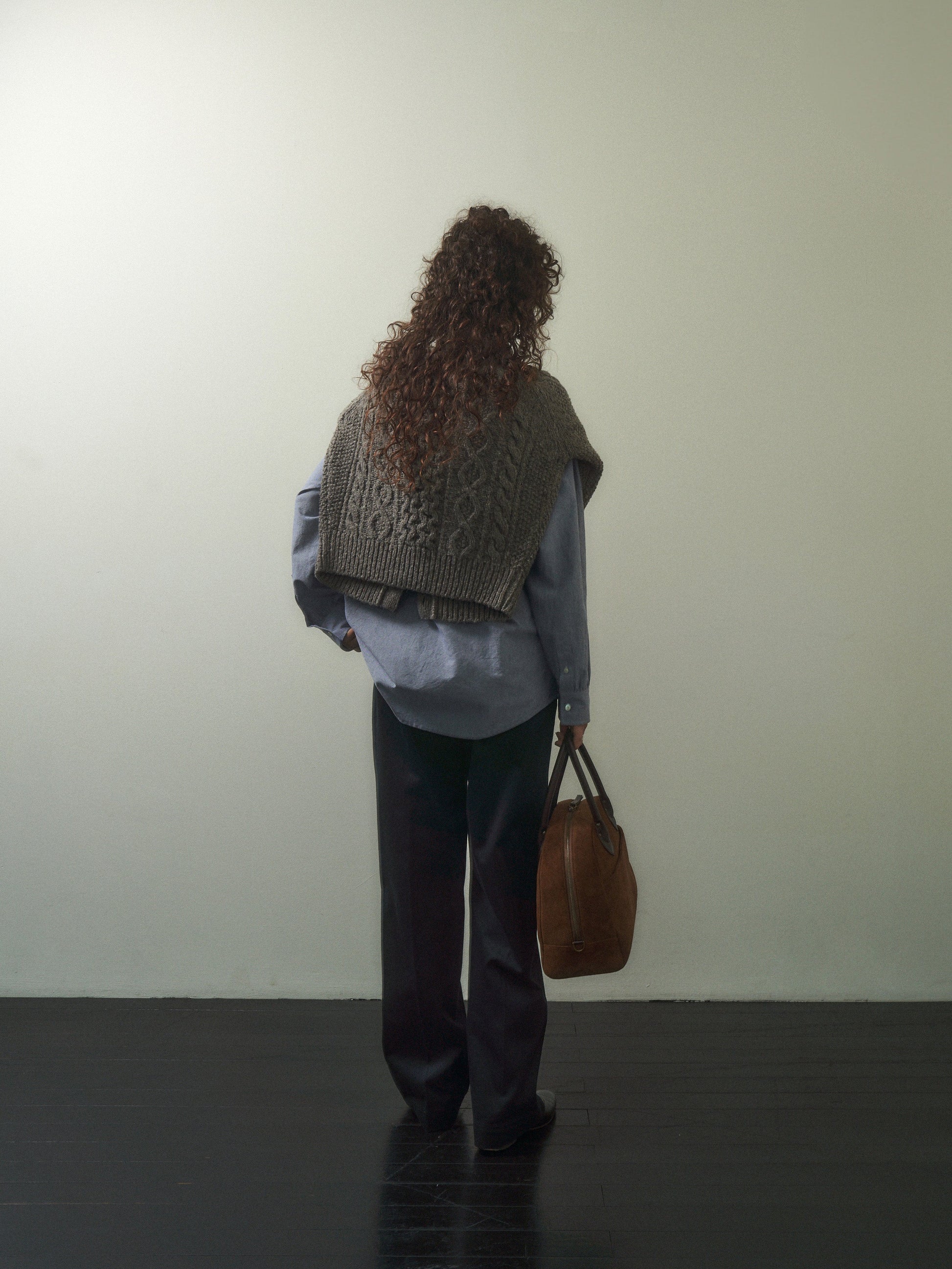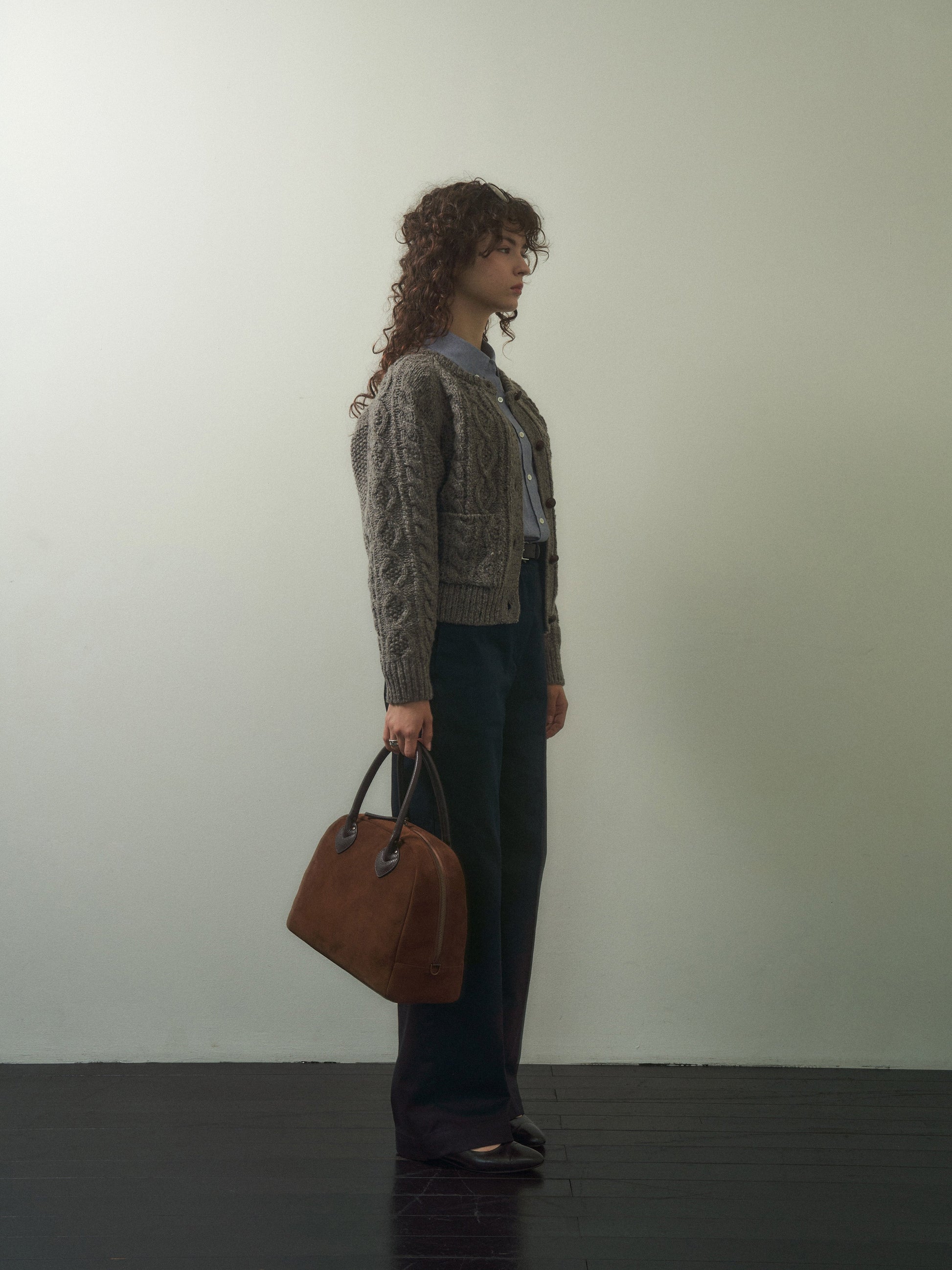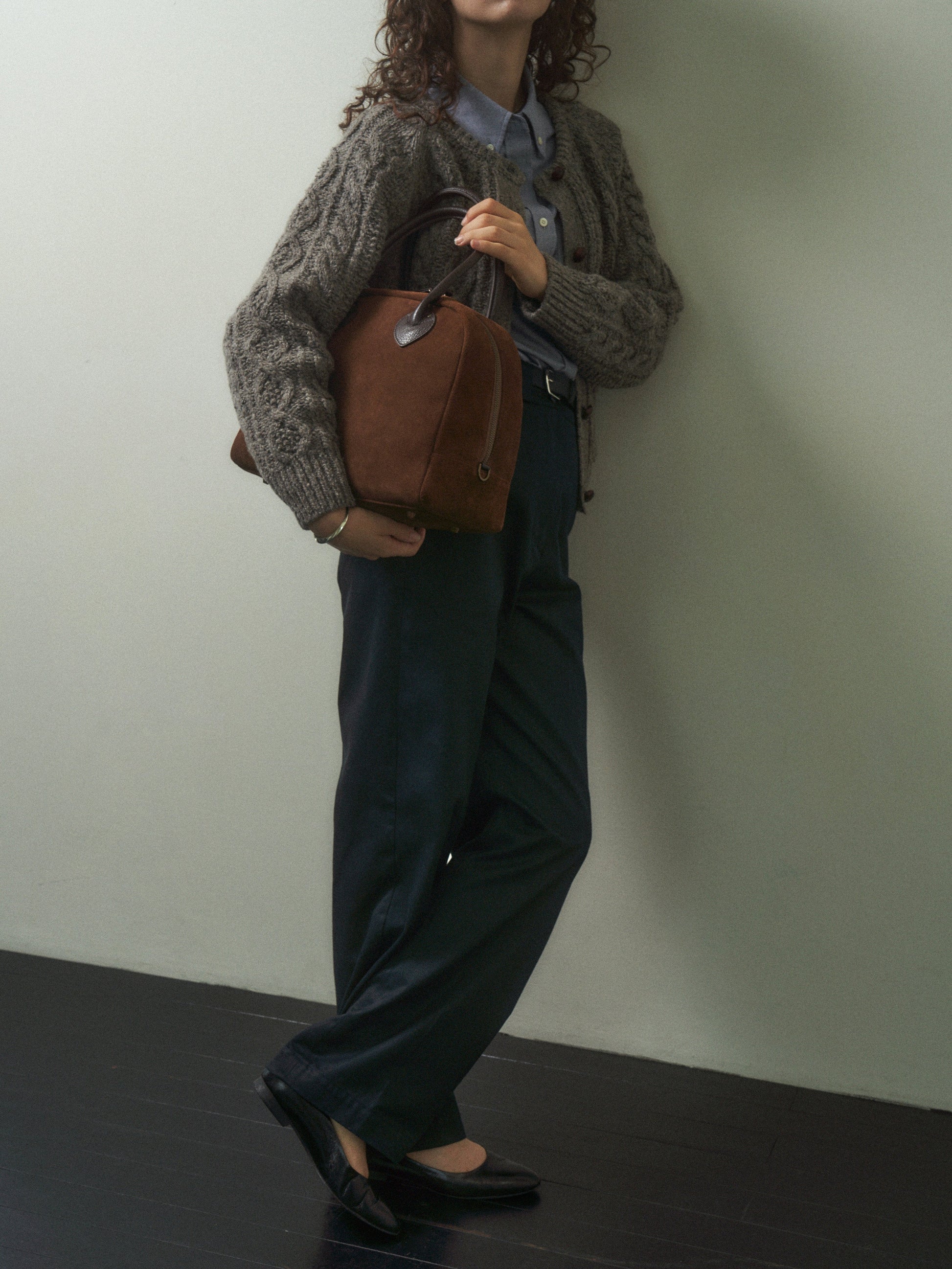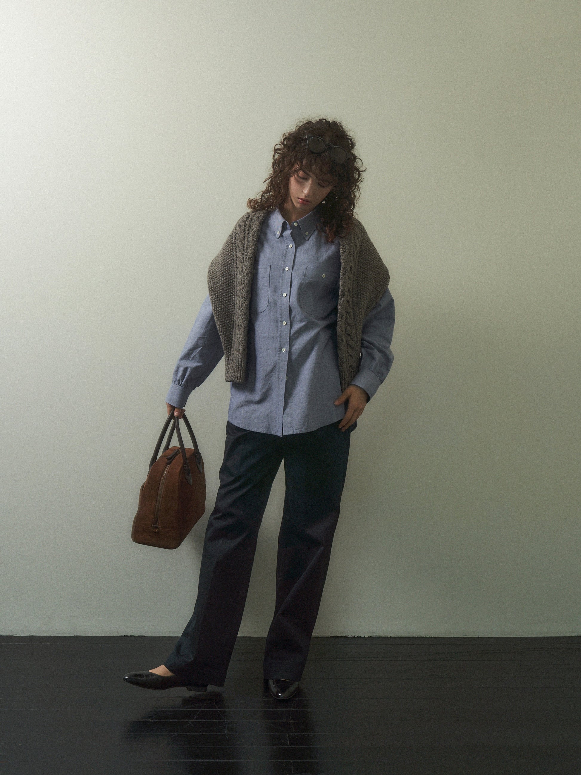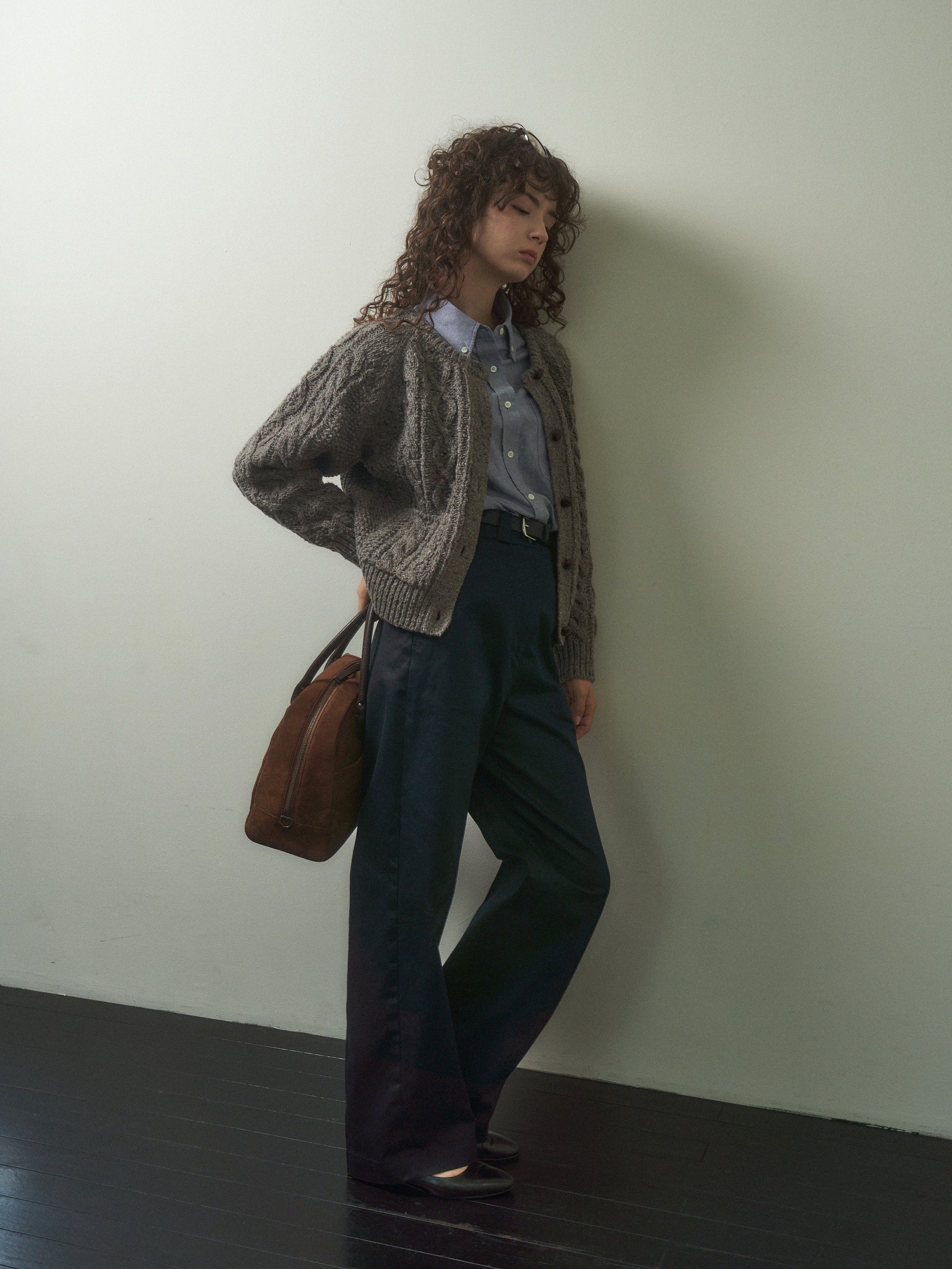 女性らしいシルエットを引き立てるハイウエストに、リラックス感のあるストレートフィット。センタープレスを施すことで、上品で端正な佇まいを演出します。存在感のある太めのベルトループと、さりげなく映えるブラウンのナットボタンが、シンプルな中に程よいアクセントを添えています。裾はクリーンに仕立てられており、ロールアップもしやすく、その日の気分やスタイルに合わせた着こなしが可能です。