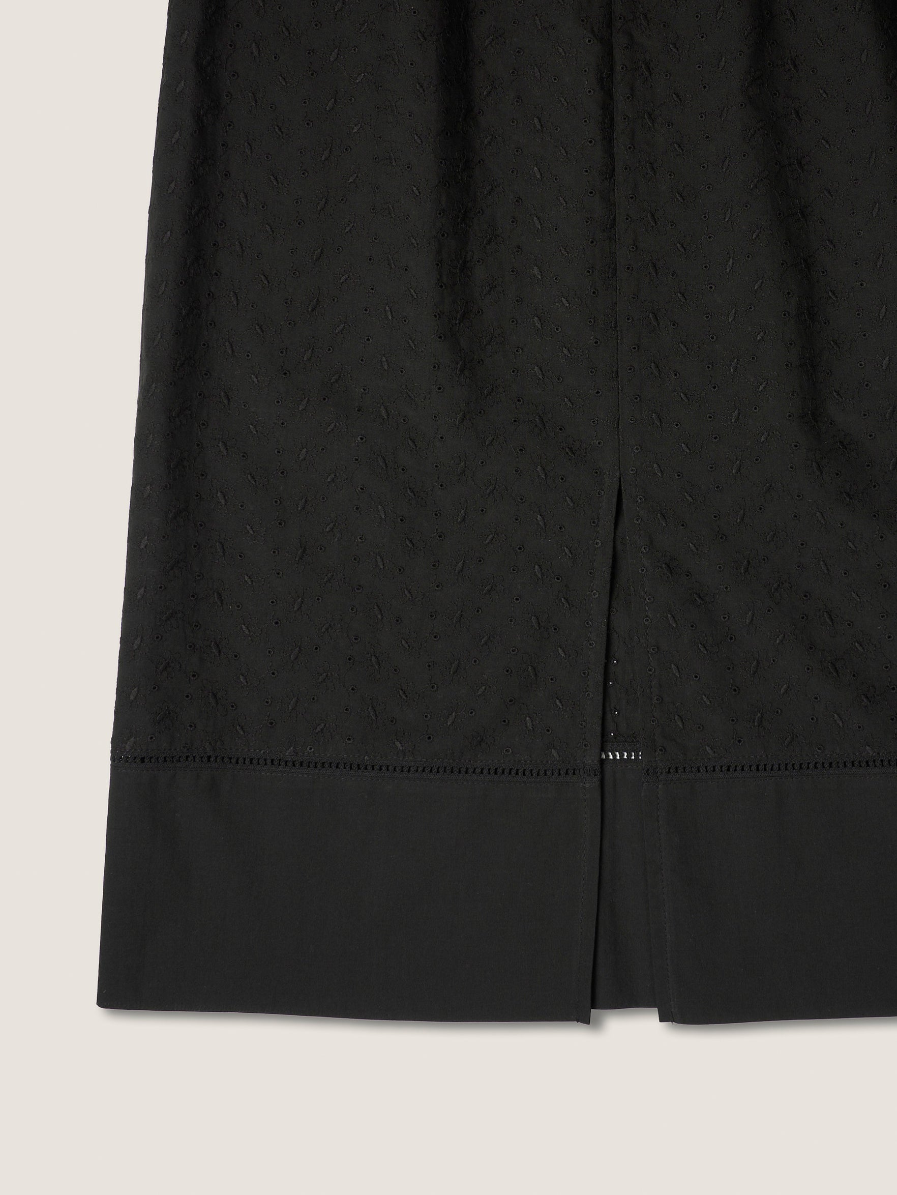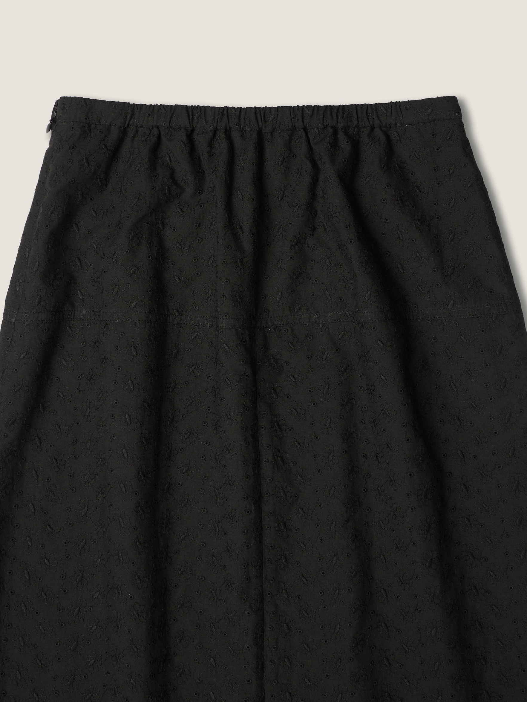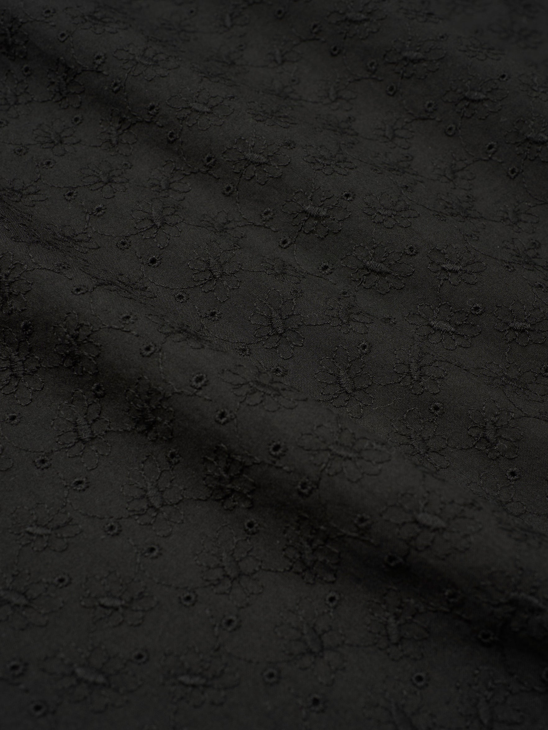 素材にはコットン100%を使用し、繊細なフラワー刺繍をあしらうことで、可憐でやさしい印象に仕上げました。裾まわりにはアイレット刺繍をたっぷりと施し、立体感と程よいボリュームをプラスしています。