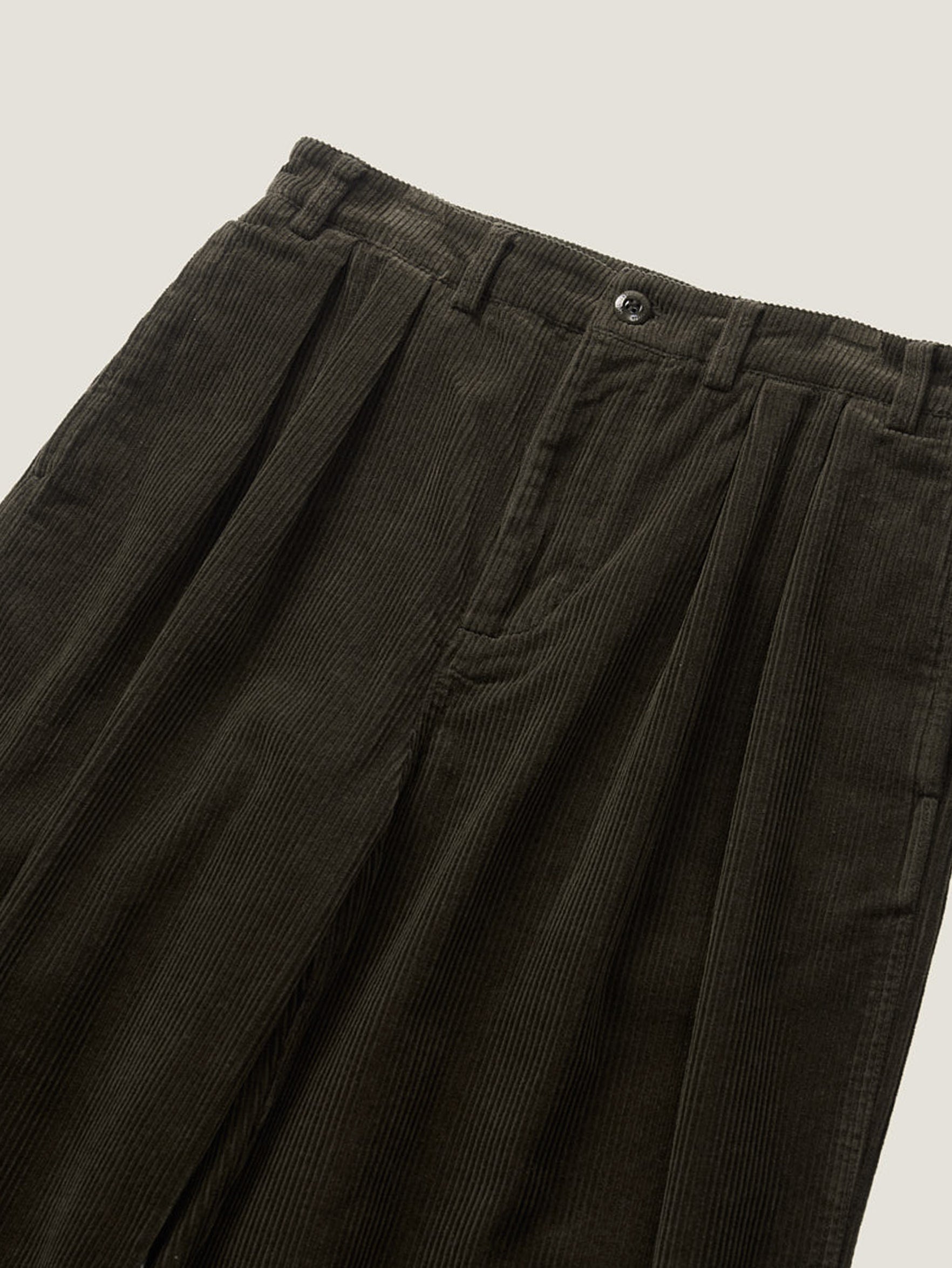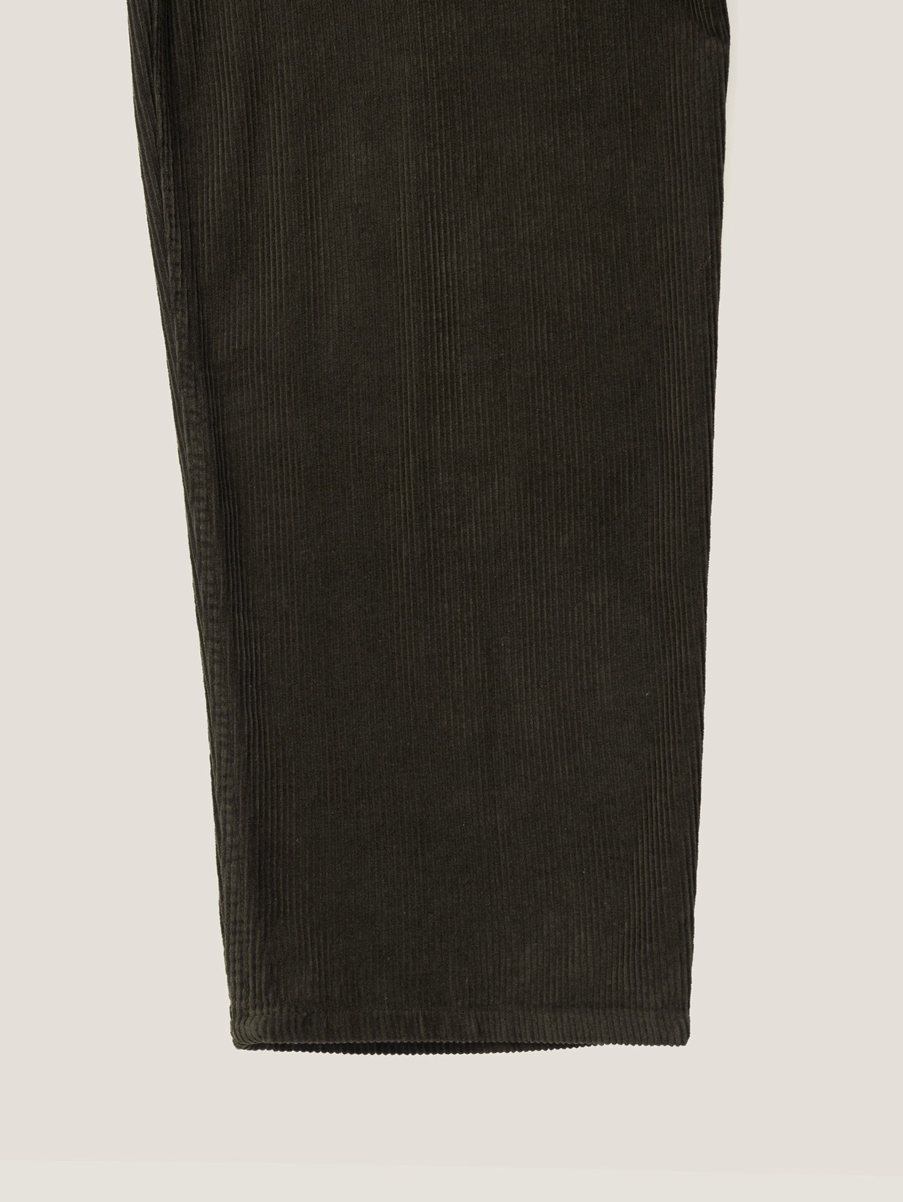 コットン100%の太畝コーデュロイ生地を使用し、ナチュラルなウォッシュ加工を施すことで、表面の質感をより柔らかく豊かに仕上げ、まるでヴィンテージのコーデュロイパンツを穿いているような感覚を与えます。ミッドライズのウエストは安定した着用感をもたらし、ヒップから腿にかけてはゆとりを持たせてクラシックなボリューム感を演出。裾に向かって滑らかに絞られるテーパードシルエットは、武骨さの中にも抑制の効いた上品さを感じさせます。
