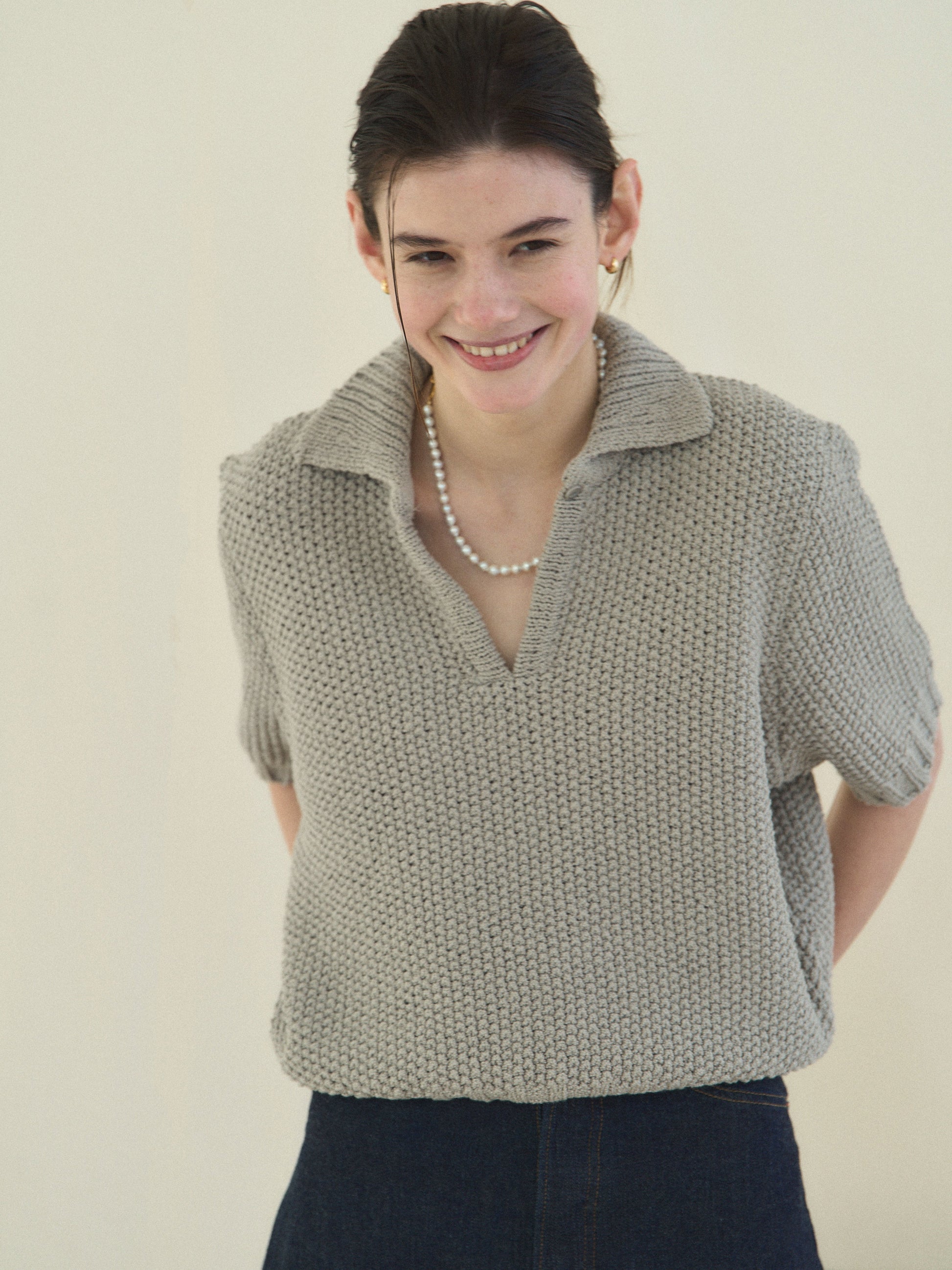 裾に向かって自然にすぼまるやや短めの着丈は、安定感のあるフィット感と美しいバランスでさまざまなボトムスと相性が良く、幅広くお楽しみいただけます。ネックラインには小さなボタンとループがあしらわれており、ボタンを留めていただくときちんとしたポロスタイルに、開けていただくとリラックスしたVネックのような雰囲気でお召しいただけます。