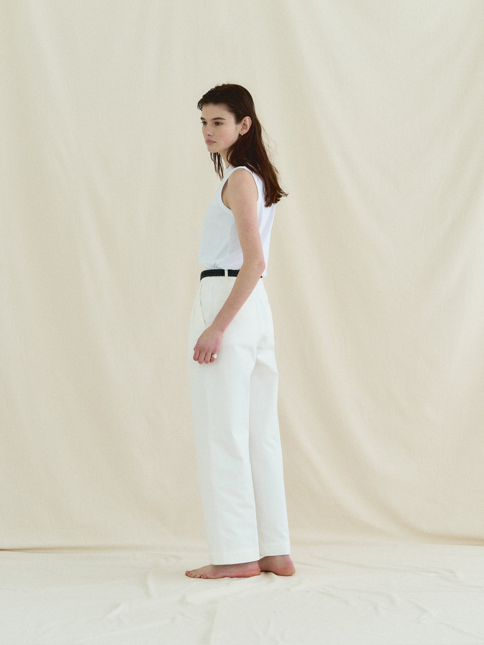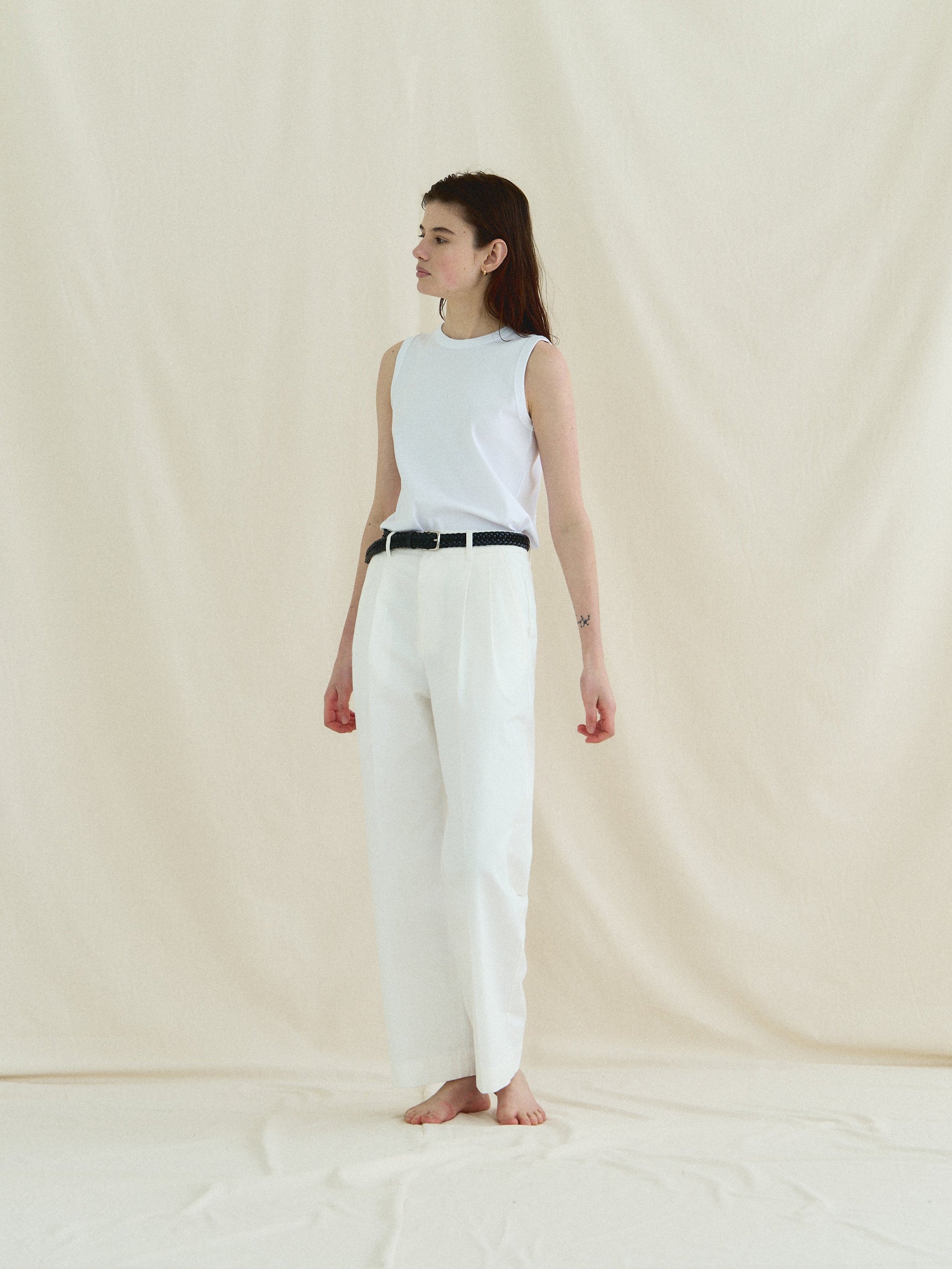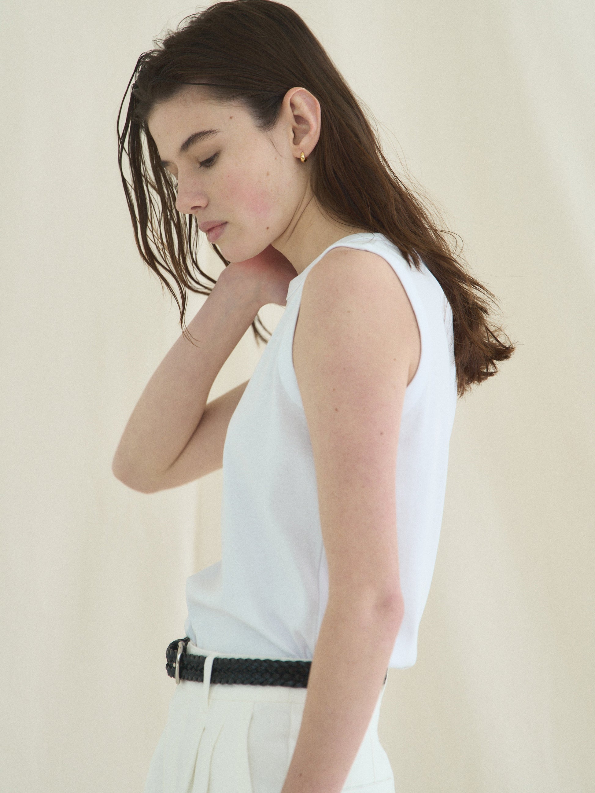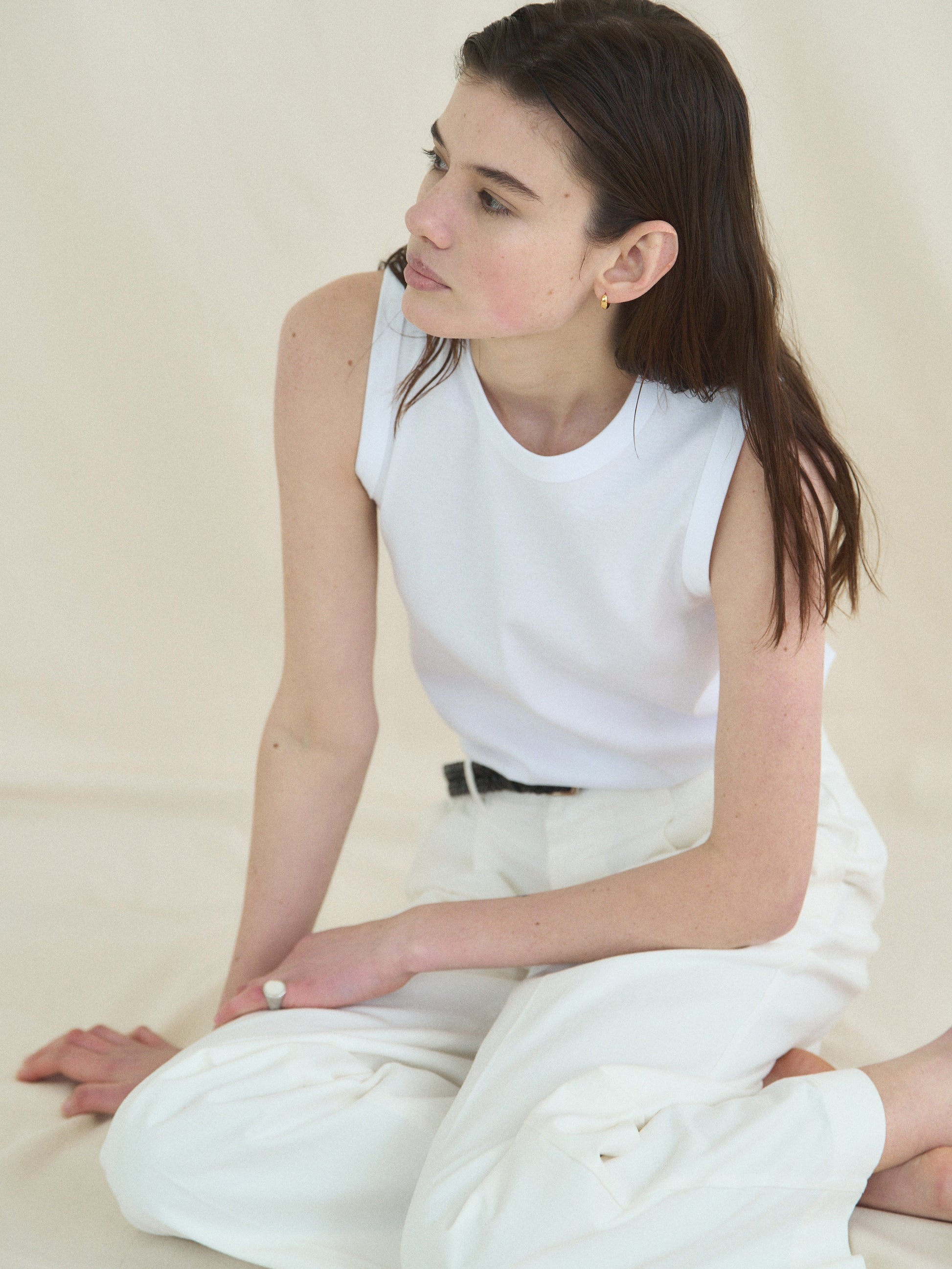 「Michelle Cotton Sleeveless」は、90年代のシンプルで快適な魅力を現代的に表現した一枚でございます。100%コットン素材にシルケット加工を施すことで、シルクのような上品な光沢と滑らかな肌触りを実現し、快適な着心地をお楽しみいただけます。