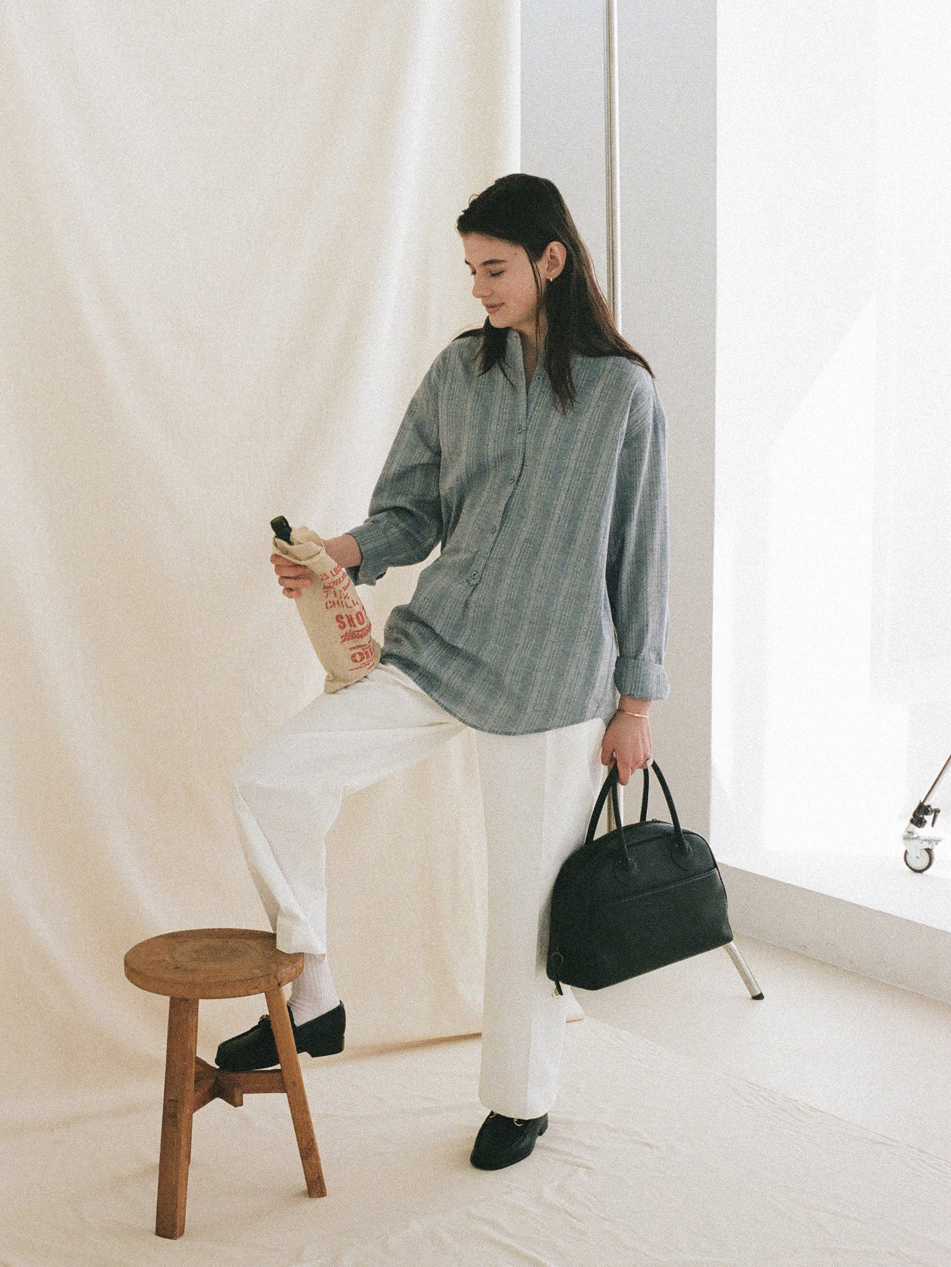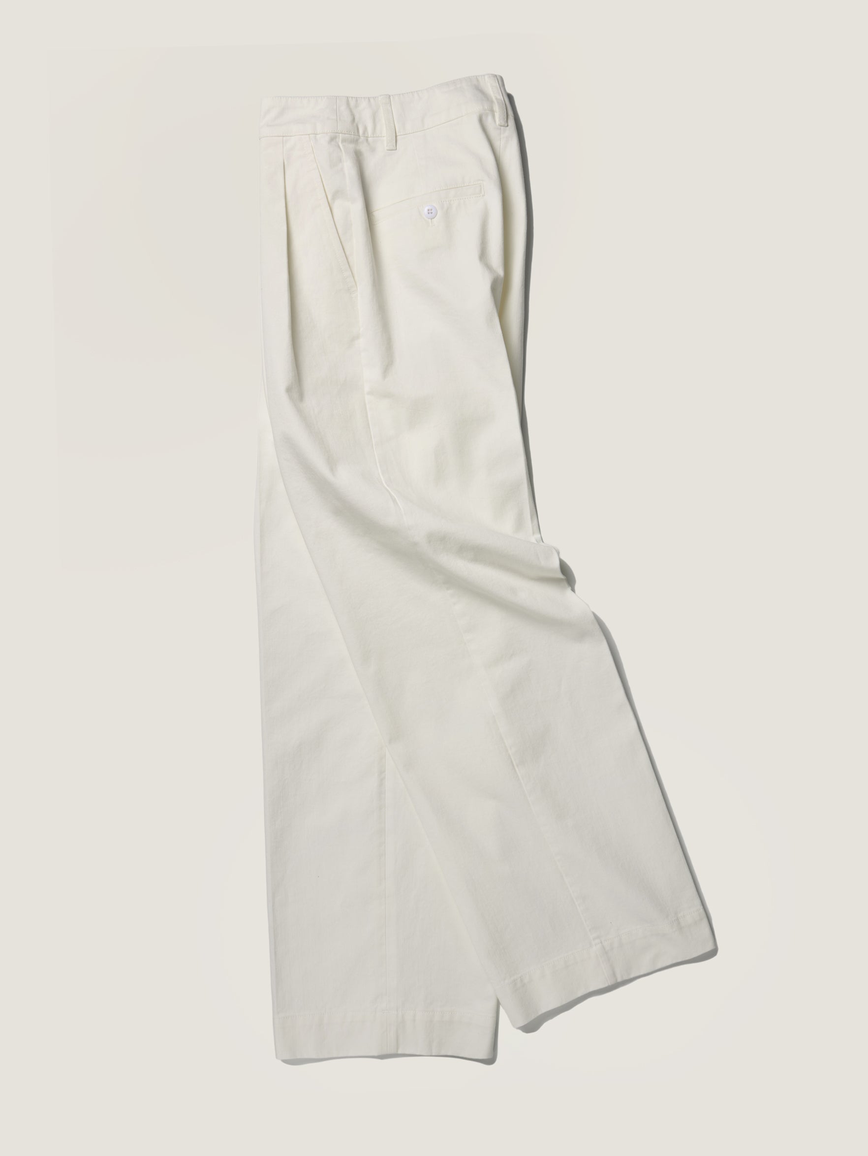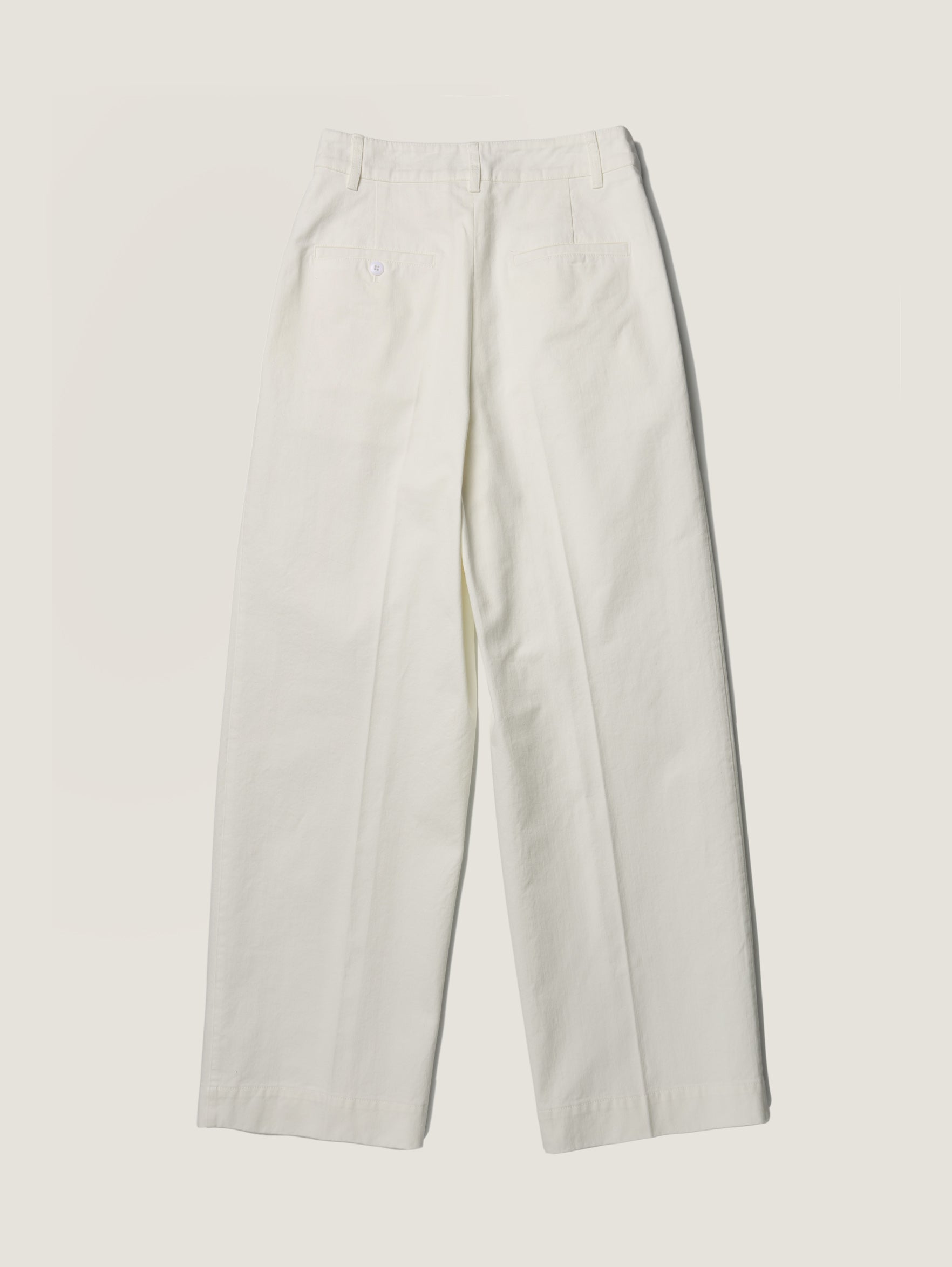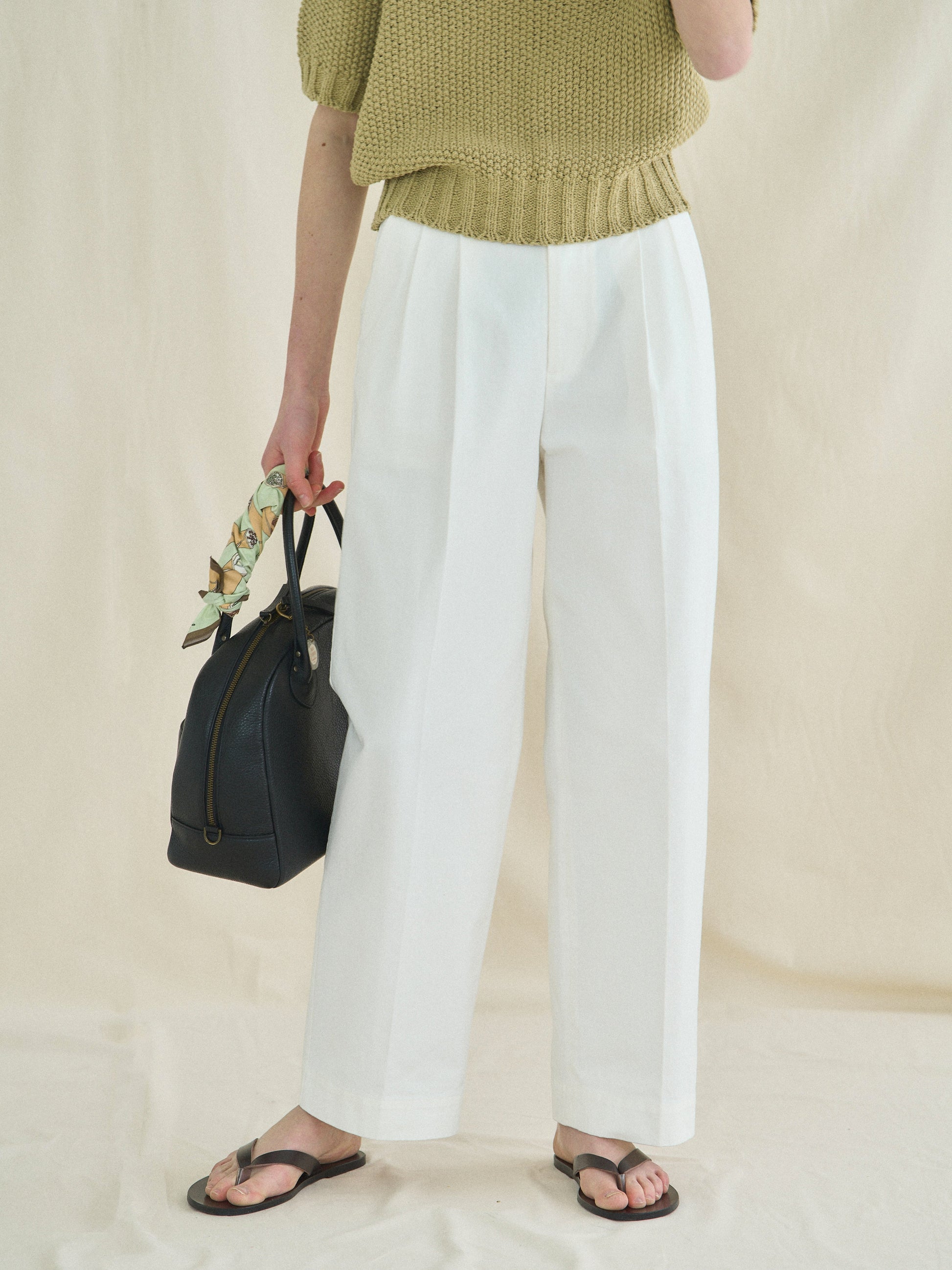 特徴的なディテールとしては、なめらかな質感の日本製樹脂ボタンを採用。フロントプリーツは、快適さと立体感を高める役割を果たし、やや高めのウエストと太ももから裾にかけてのリラックスしたフィット感が、さまざまな体型に自然で美しいシルエットをもたらします。
