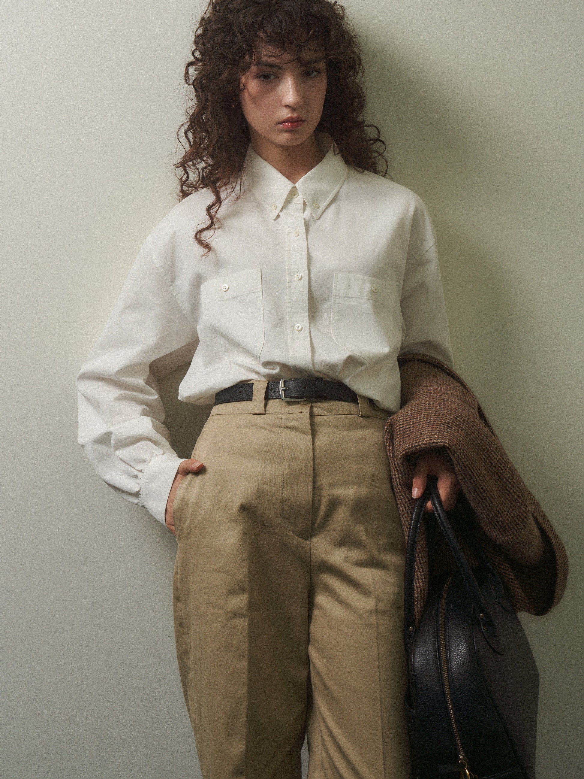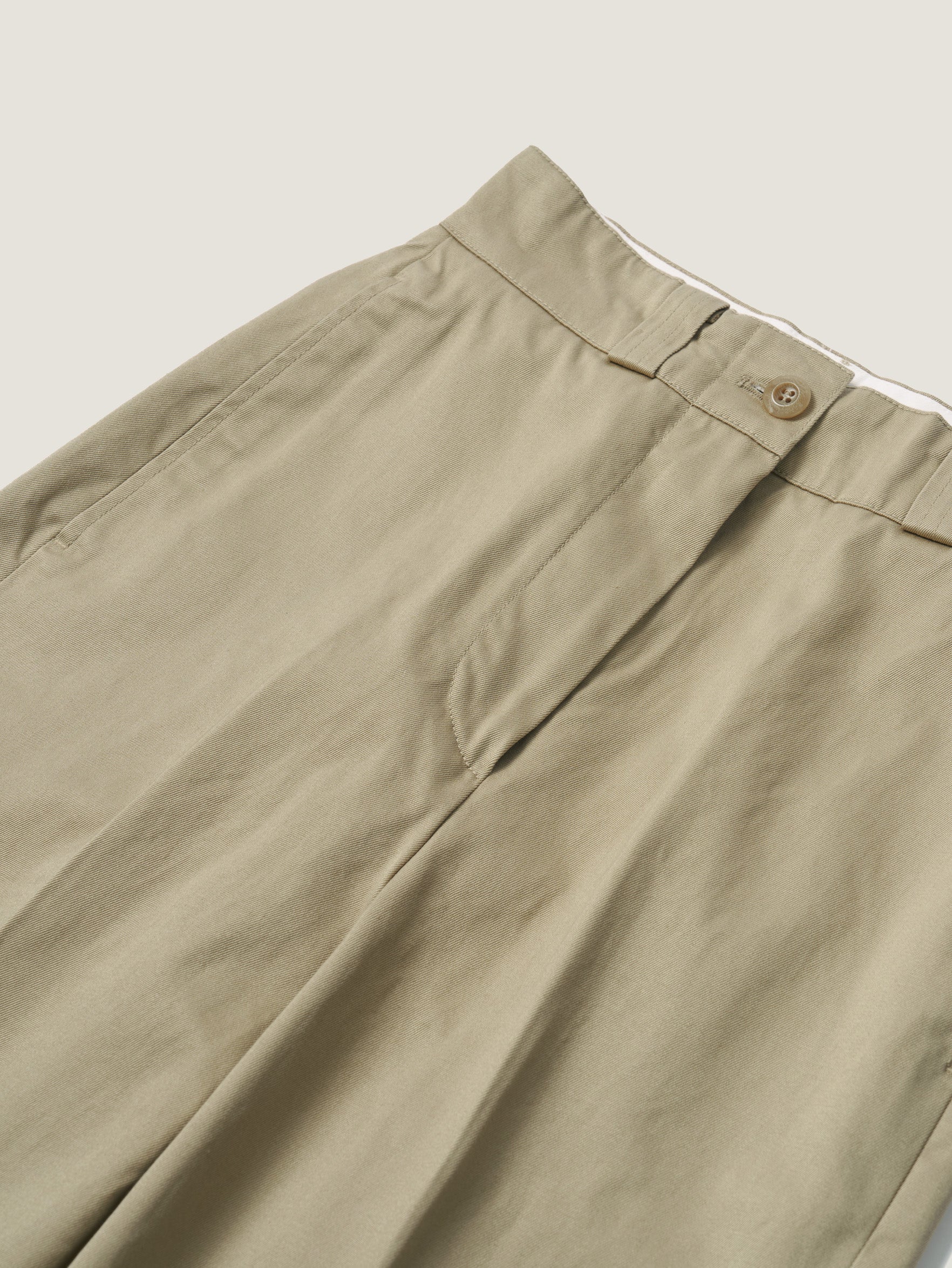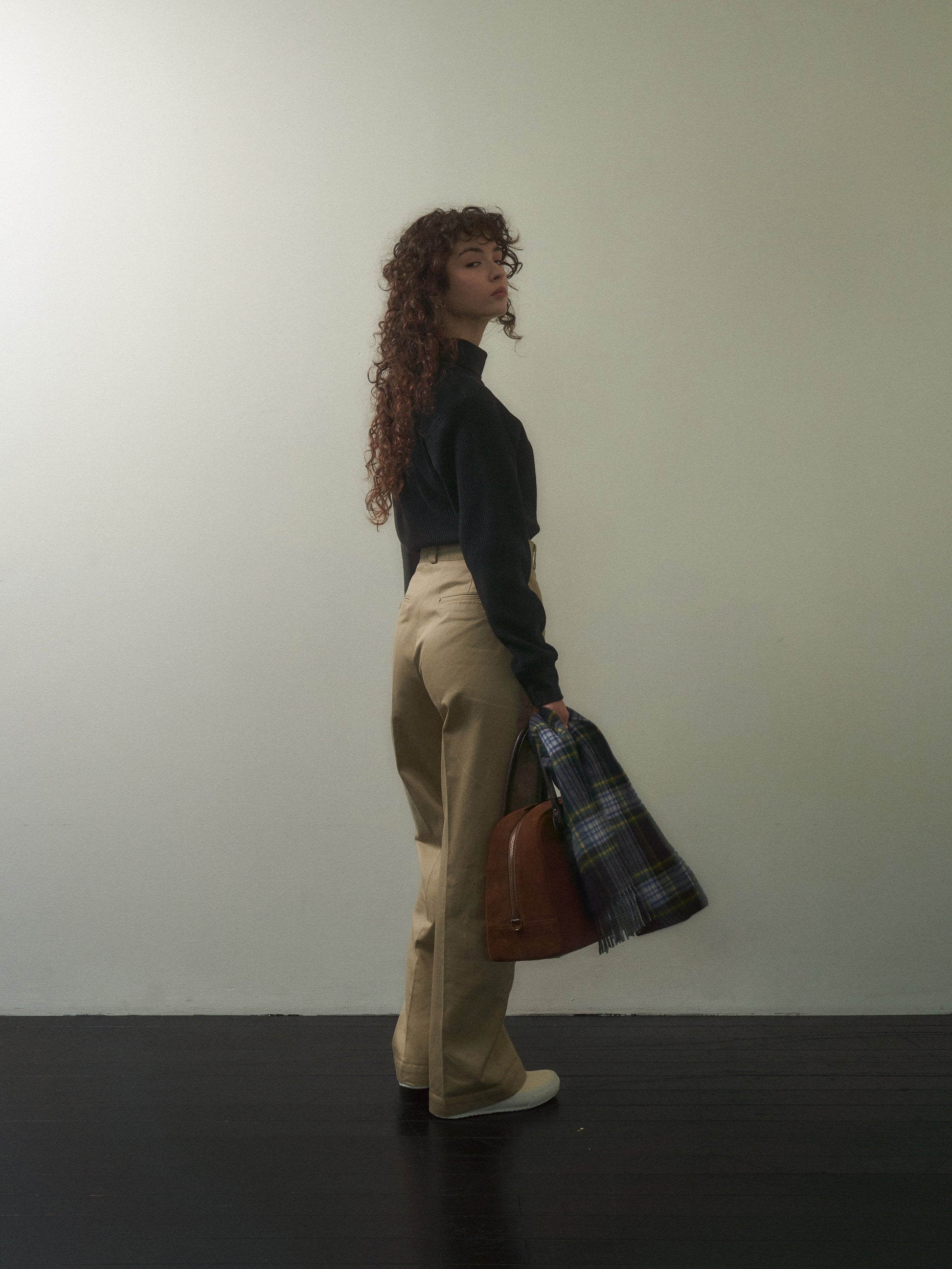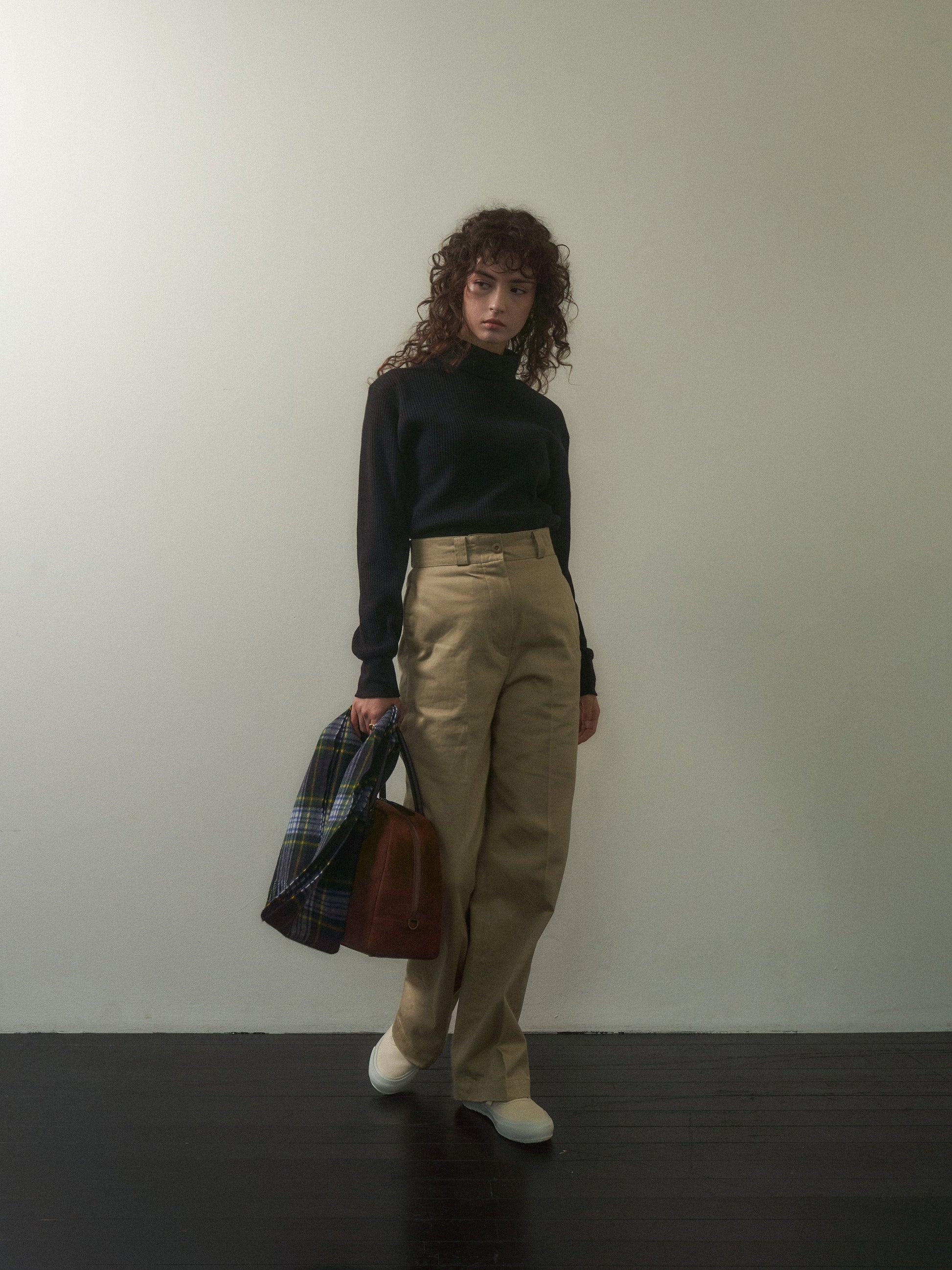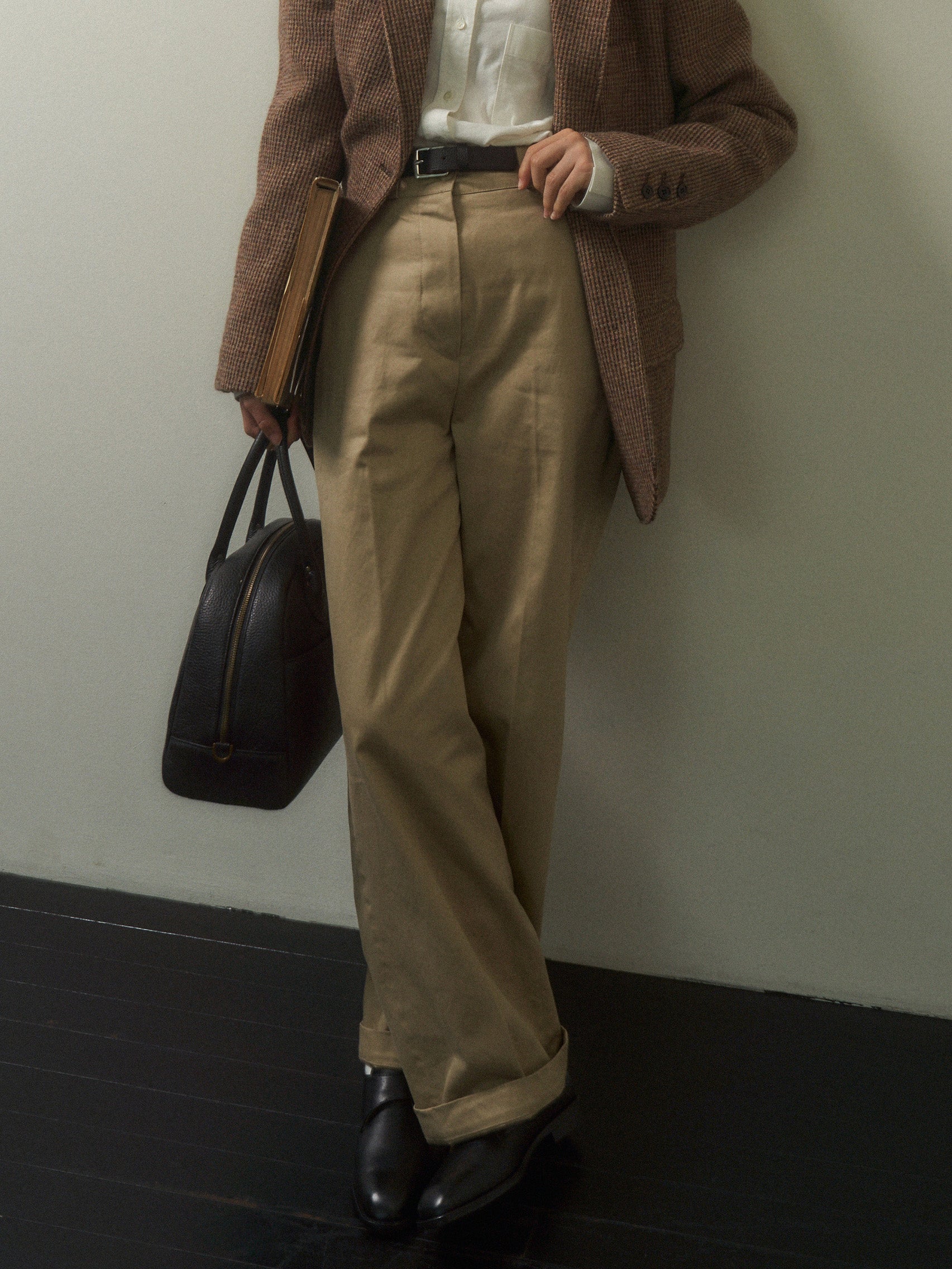 女性らしいシルエットを引き立てるハイウエストに、リラックス感のあるストレートフィット。センタープレスを施すことで、上品で端正な佇まいを演出します。存在感のある太めのベルトループと、さりげなく映えるブラウンのナットボタンが、シンプルな中に程よいアクセントを添えています。裾はクリーンに仕立てられており、ロールアップもしやすく、その日の気分やスタイルに合わせた着こなしが可能です。