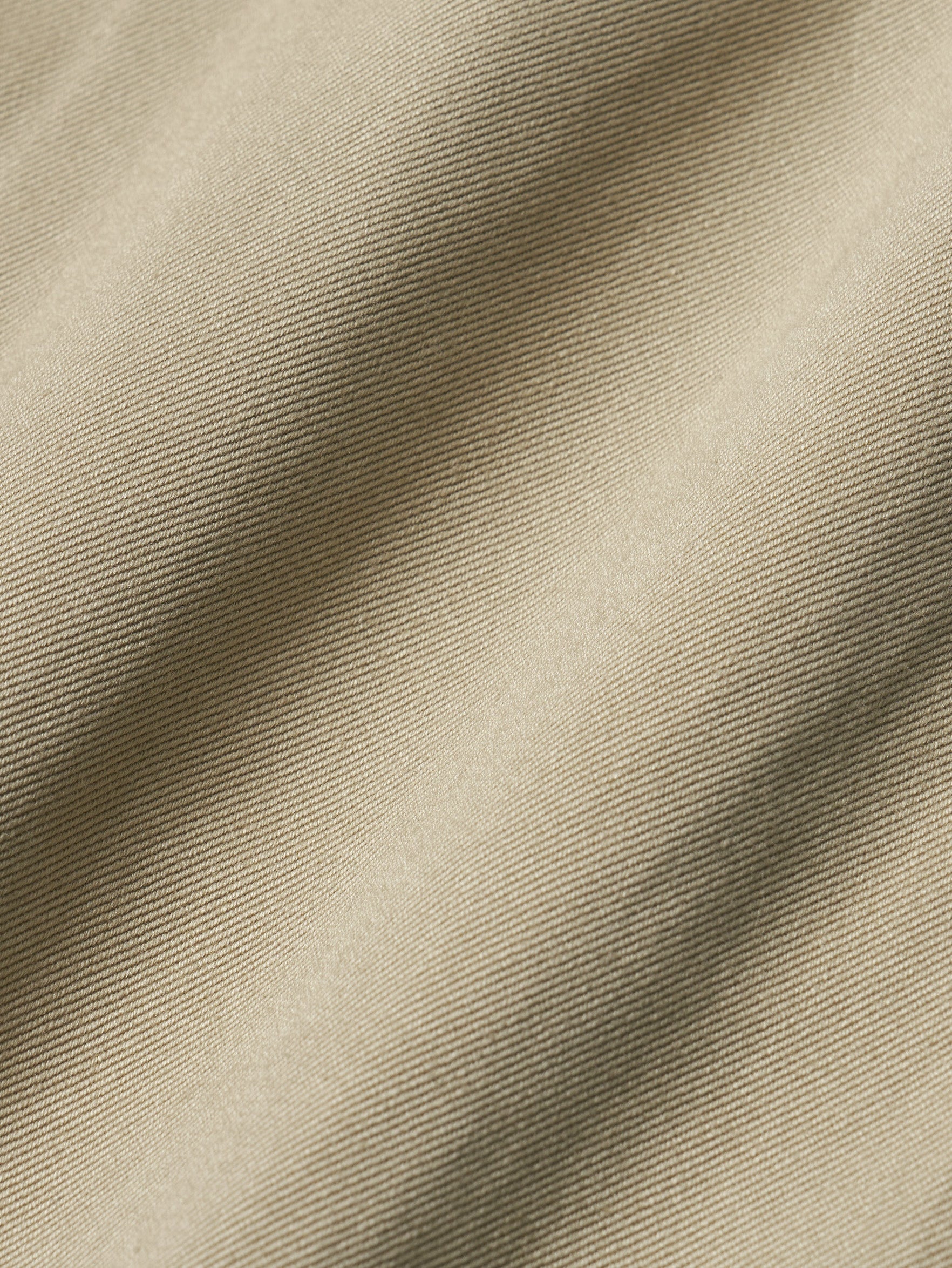 素材には日本製の高密度チノクロスを採用。適度なハリと上品な光沢があり、仕上げに施したノーマルウォッシュ加工により、素材本来の風合いと柔らかな穿き心地を実現しています。