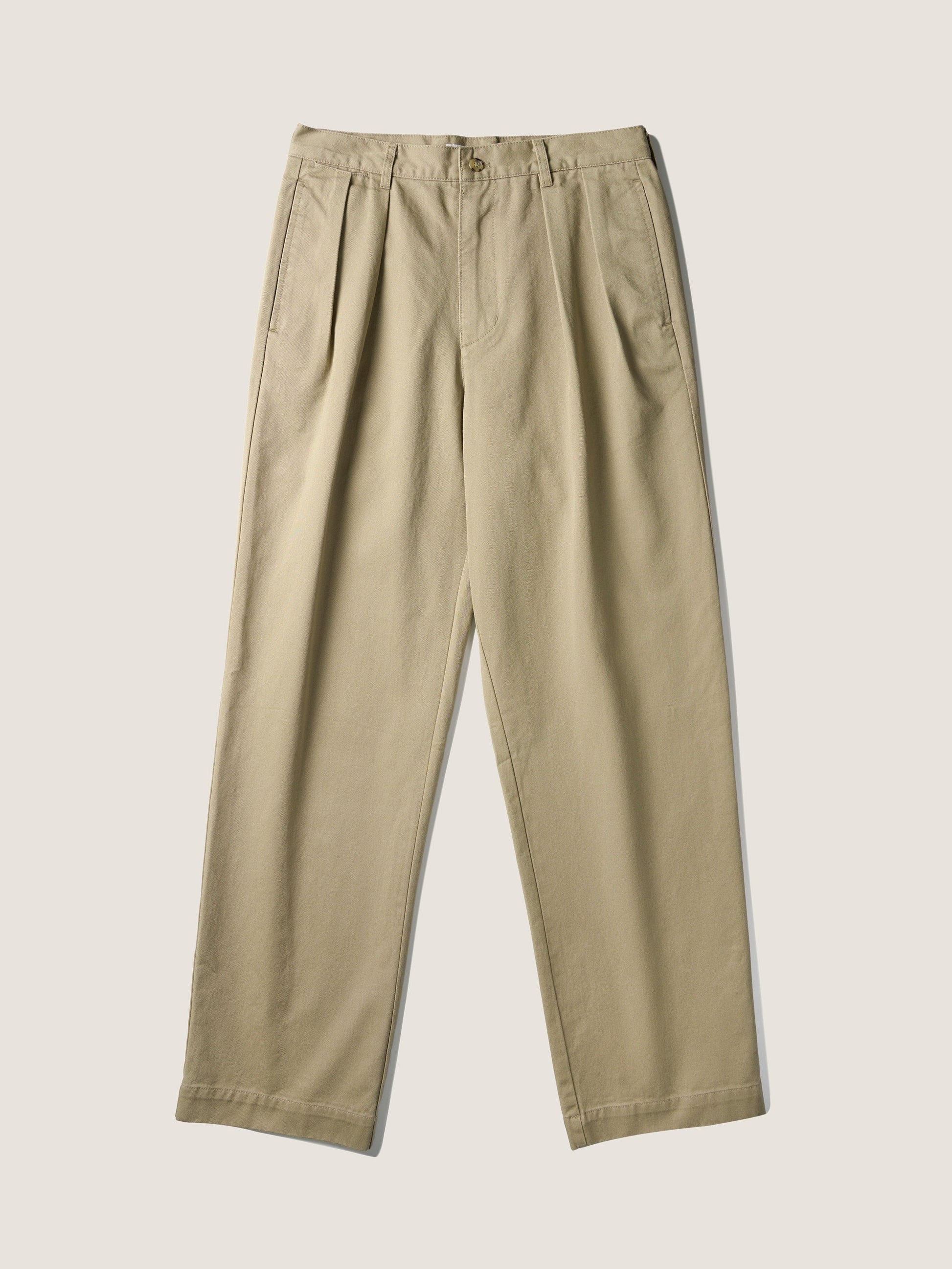 生地には、日本製の高密度コットンツイルを使用。耐久性に優れ、通気性も高く、快適な穿き心地を実現しました。デザイン面では、フロントに2本のタックとコインポケットを配し、さりげなく構築的なフォルムを演出しています。太ももまわりには程よいゆとりを持たせ、裾に向かって緩やかにテーパードするラインは、すっきりとしたモダンな印象に仕上がっています。裾をロールアップすれば、軽やかでこなれたカジュアル感もお楽しみいただけます。