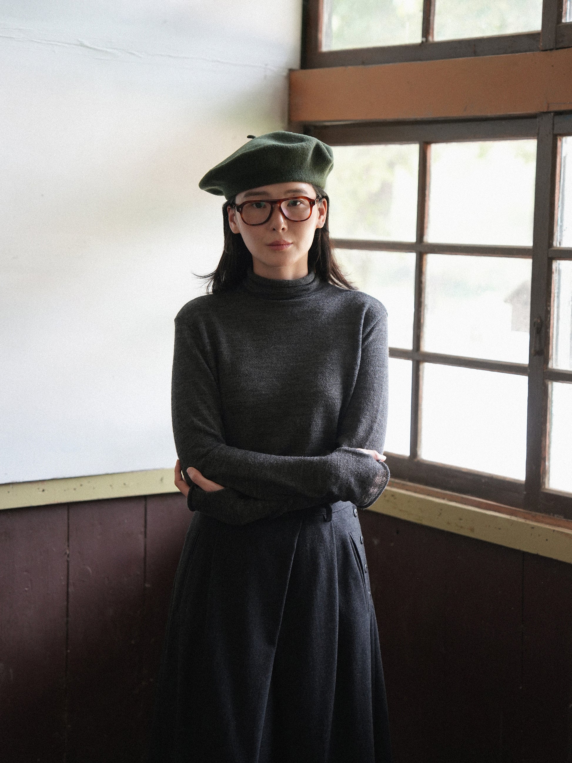 落ち葉のように繊細でドライなタッチの、ウール100%タートルネックトップをご紹介いたします。モスクレープ(Moss-crêpe)組織は、ふわりと積もった苔を思わせる独特の表面感を持ち、さりげないシアー感が薄手ながら奥行きのある季節感を演出いたします。適度な重さと軽やかな肌触り、優れた伸縮性により、1枚でも肌にやさしくフィットし、秋冬の体温維持にも最適です。適度なゆとりのあるシルエットはボディラインに沿って自然に流れ、スリムに見せつつ快適な着心地を実現。タートルネックは首に締め付け感が出ない設計で、折り返したり自然にしわを寄せたりしてお楽しみいただけます。袖口のサムホールカフスは手の甲までやさしく包み込み、保温性とスタイル性を両立。レイヤード時に袖がめくれ上がるのを防ぎ、安定した着用感を提供いたします。秋は1枚で、冬はシャツやニット、カーディガンのインナーとしても活躍する、使い勝手の良いレイヤリングアイテムでございます。