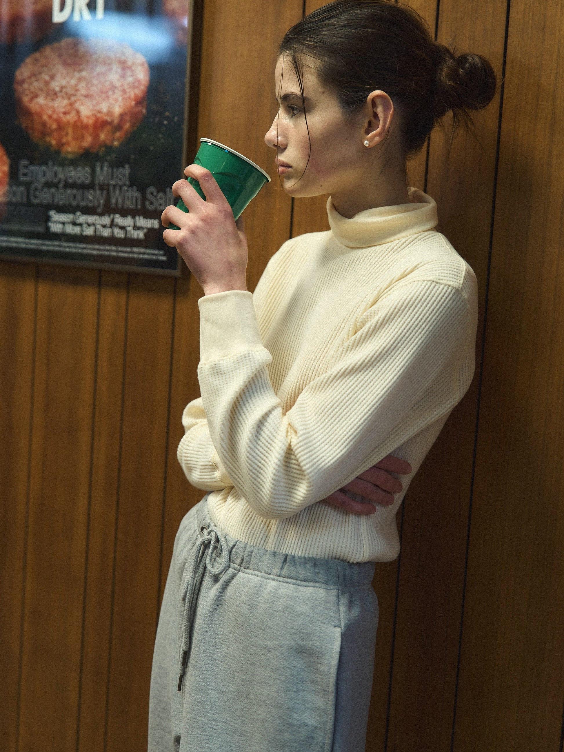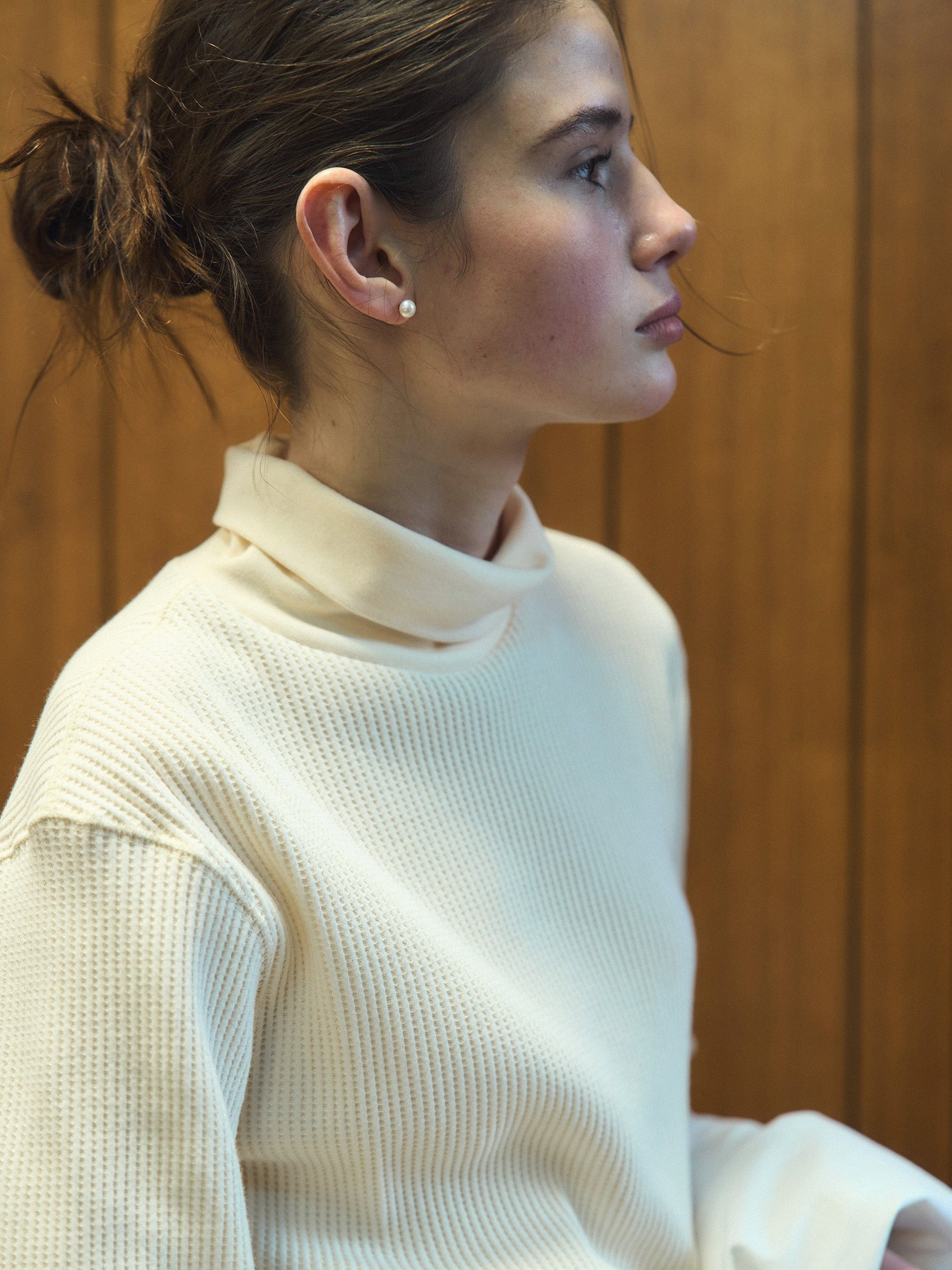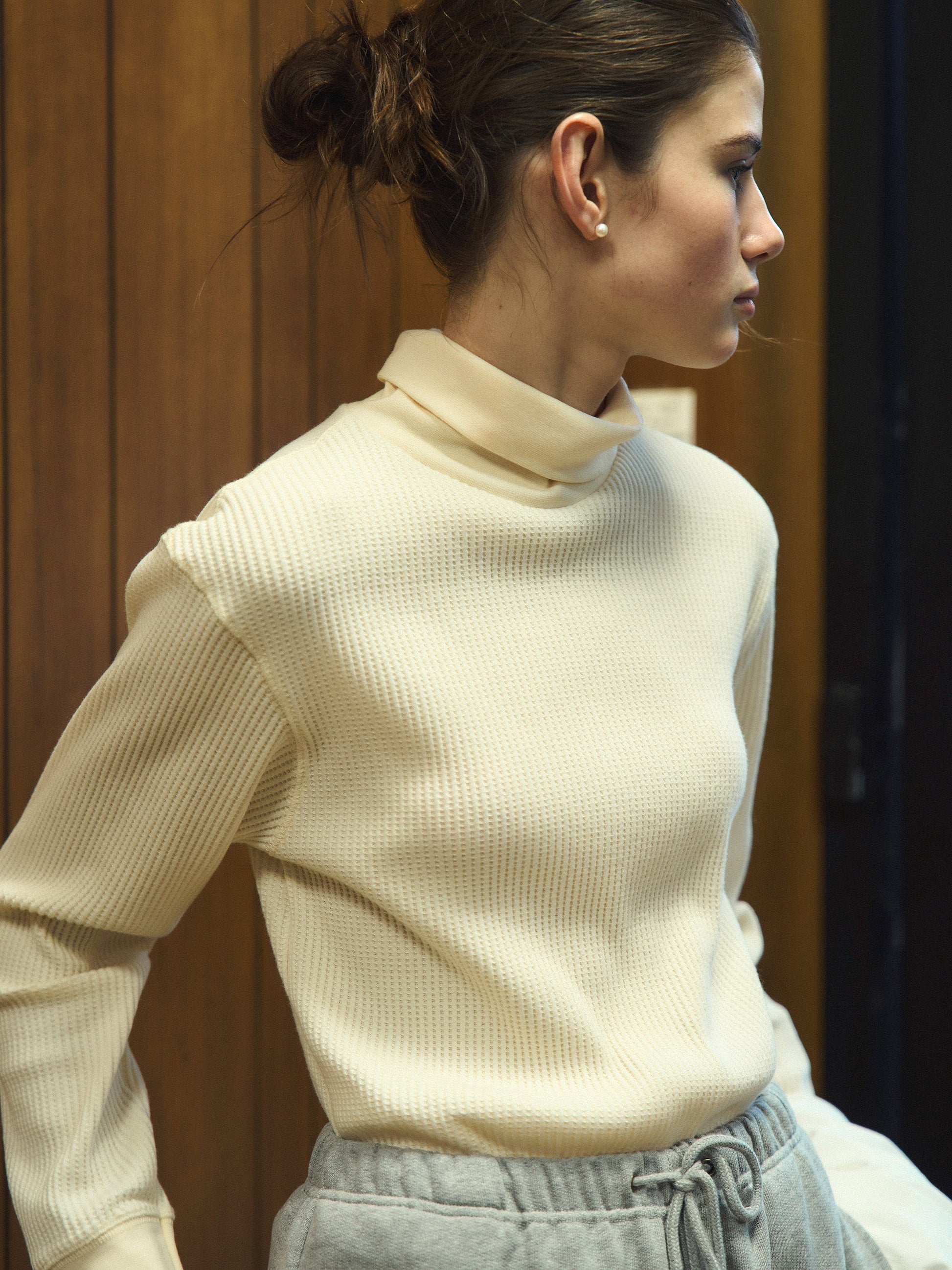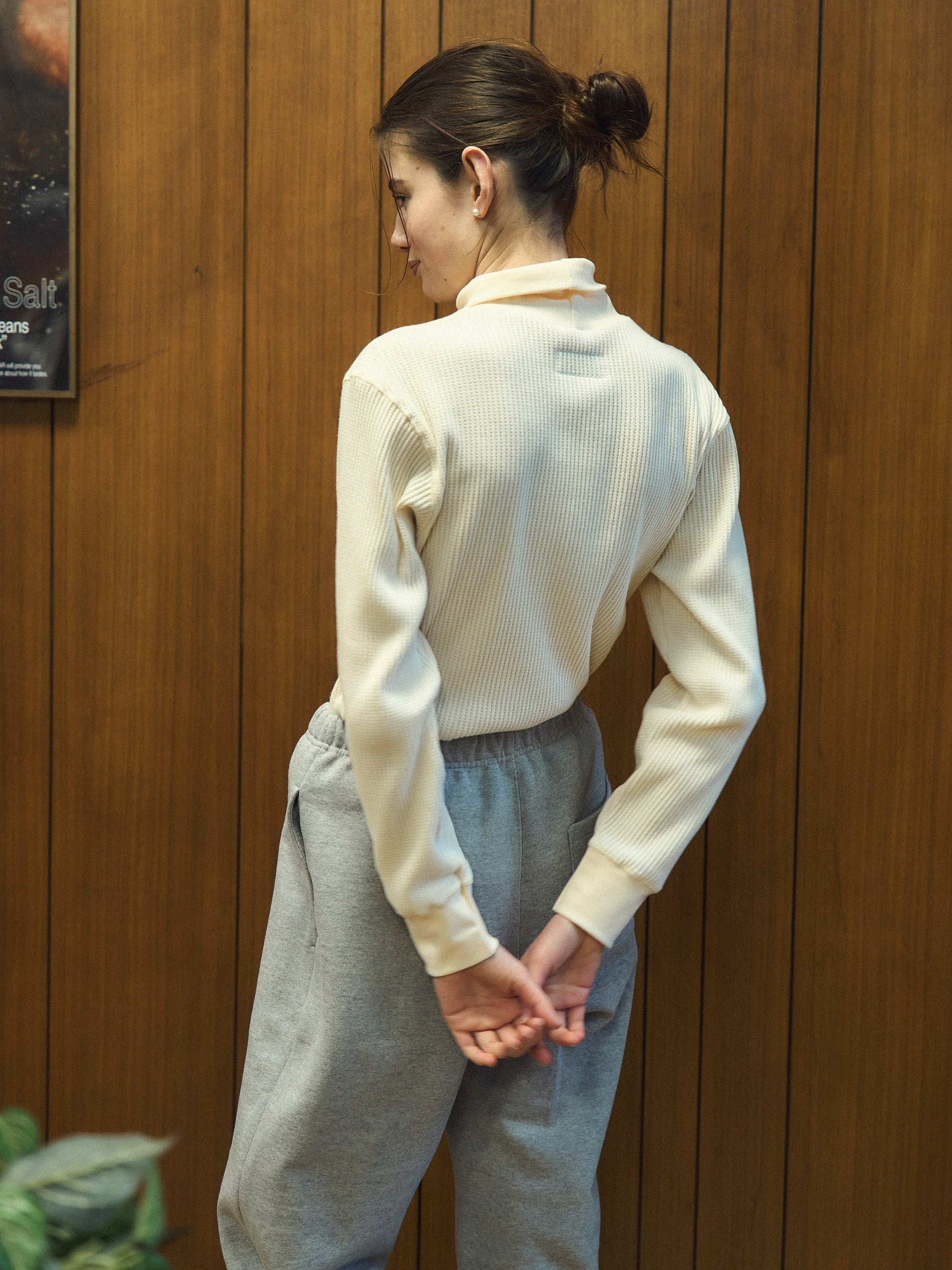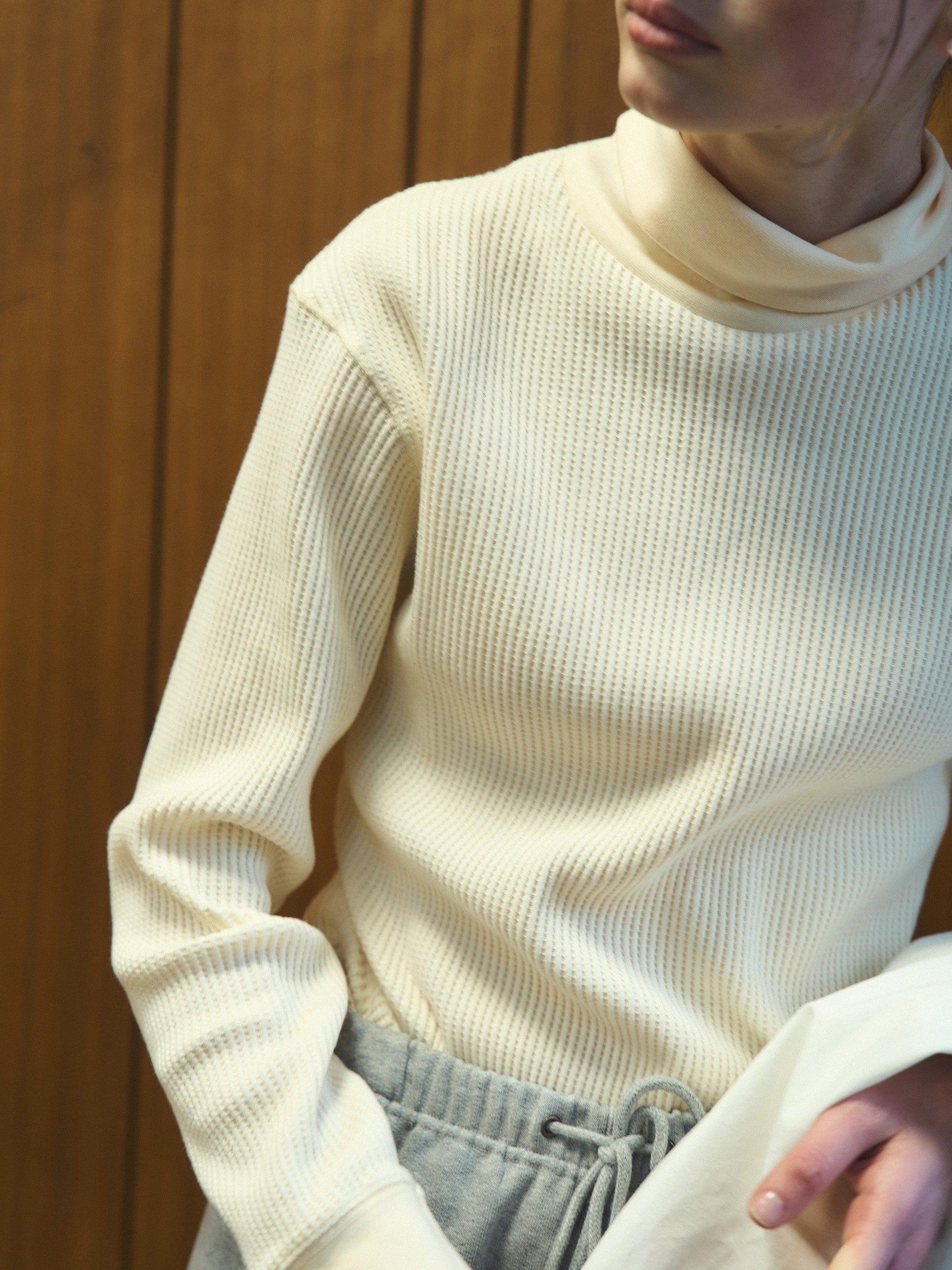 リラックス感のあるタートルネックは折り返して柔らかなネックラインを演出でき、程よい着丈とゆとりのあるシルエットで、一日中快適にお過ごしいただけます。従来のサーマルトップスは体にフィットしがちですが、Outfittersのワッフルタートルティーはドロップショルダーとゆったりとしたシルエットで、1枚でも洗練されたスタイルをお楽しみいただけます。